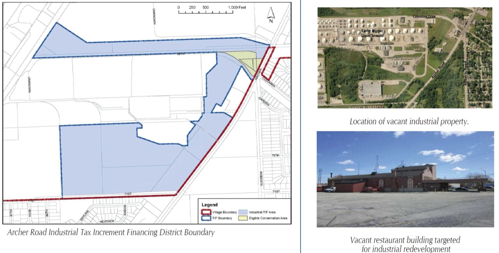 In March 2015, the Village of Bedford Park engaged Teska Associates, Inc. to evaluate vacant parcels along Archer Road for TIF eligibility. These parcels include the recently vacant Landmark Banquets facility, and numerous industrially zoned vacant parcels. These industrial parcels had remained vacant for many years and qualified as an Industrial Park Conservation Area eligible for TIF designation. The Archer Road Industrial tax Increment Financing District was approved in October, 2015.