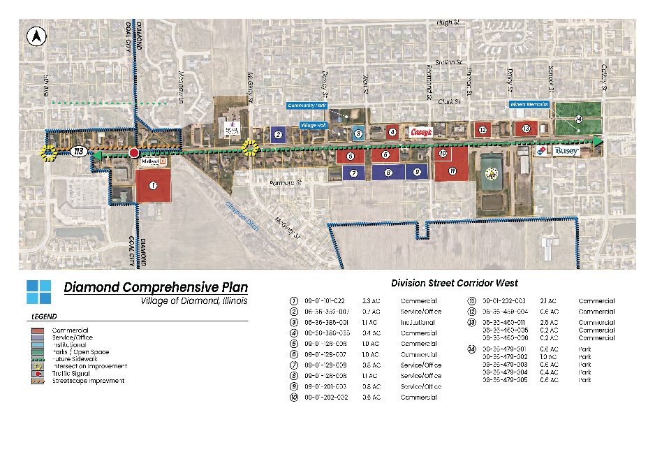 Diamond, a growing small community situated along the border of Will and Grundy Counties, benefits from its strategic location and excellent transportation access. To better assess current conditions and refine its development goals, the Village partnered with Teska to update its 2015 Comprehensive Plan (also prepared by Teska). Key updates include adjustments to transportation and future land use recommendations, along with new proposals for the Division Street Corridor and renewable energy initiatives. The updated Plan will serve as a guiding framework for community and capital improvements while supporting the Village's efforts to secure funding through grants and other municipal resources.