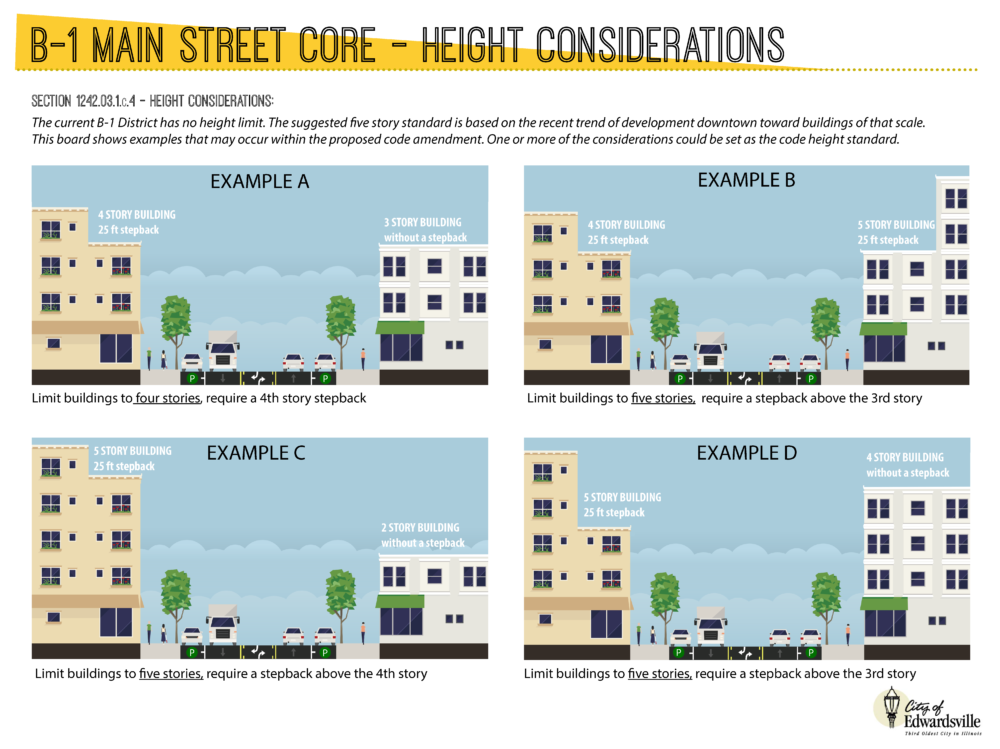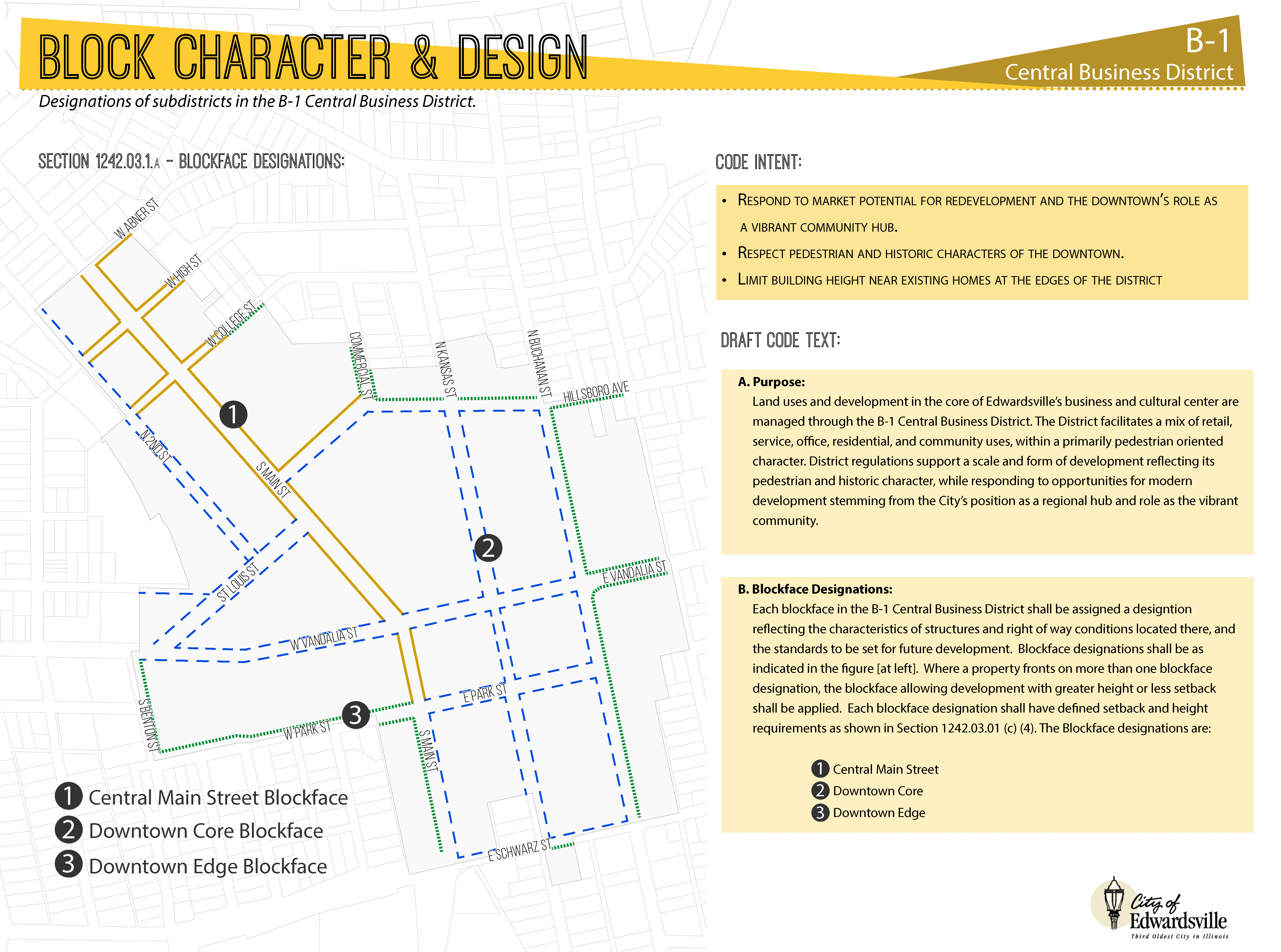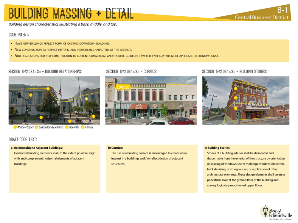 The downtown zoning and adjacent transitional zoning districts have been revised and adopted as a result of the work. Based on input from the community, specific conventional and form-based zoning standards were developed for these districts to support desired development. Teska and the City staff continue working together on the remaining four zoning revisions. We are currently developing Design Guidelines for the City and revising the zoning district that regulates development in a broad area around the City’s I-55 Interchange.